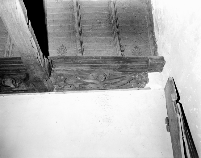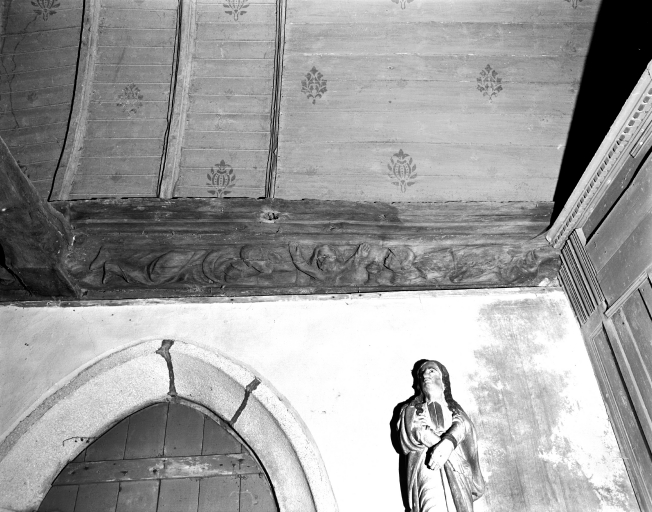 Le blochet est sculpté en forme d'homme accroupi et l'entrait est à engoulants. La représentation éventuelle de la Résurrection figure sur le mur est, tronçon sud : le Christ en buste, les bras levés est entouré de deux personnages casqués.