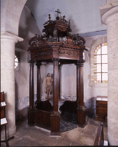 Cuve des fonts baptismaux en granite monolithe de plan ovale, h = 90. Baldaquin en bois de plan heptagonal, constitué de six colonnes lisses à chapiteaux corinthiens portant un entablement et un couronnement à volutes. Statue de saint Jean-Baptiste en ronde bosse en bois peint polychrome, h = 136.