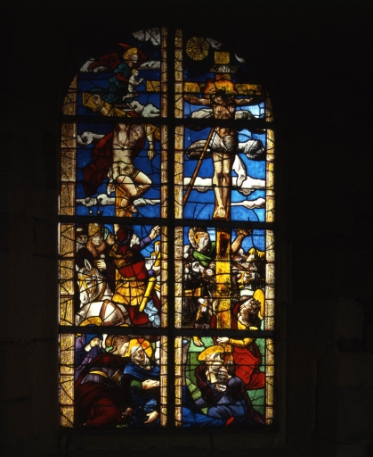 La scène de la Crucifixion est représentée sur 2 verrières à une lancette en plein cintre. Chaque baie est composée de deux travées matérialisées par des barlotières et une bande verticale ornée de rinceaux au jaune d'argent qu'on retrouve latéralement. La verrière de gauche représente le Christ et un larron ; la Vierge et Madeleine sont au pied de la croix ainsi que deux soldats à cheval ; l'un perce de la lance le flanc du Christ. La verrière de droite représente le deuxième larron avec un soldat à cheval armé d'une lance et trois autres soldats se partageant les vêtements du Christ. Cette travée est un remontage hétéroclite dans lequel on reconnaît un soldat en armure portant un bouclier sur lequel on lit la date 1564. La troisième verrière est un remontage hétéroclite sans thème de pièces et morceaux divers parmi lesquels on reconnaît saint Maurice abbé de Carnoët et l'inscription S. Morisse abbé, des hermines héraldiques, des fragments d'inscription et des personnages qui sont les morceaux originaux des verres de la Crucifixion où ils sont reproduits à l'identique : voir le personnage casqué.