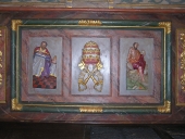 Armoiries : 3 têtes de chiens avec collier sur écu rond couronné, peintes sur le fronton du retable. Il s'agirait des armes de la famille Visdelou, seigneurs du château de Bien-Assis, commanditaires.