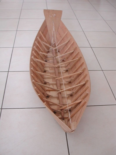 Maquette en forme, représentant une embarcation du type doris, en contre-plaqué et en métal (en cours de construction). Mesures : 107 cm de longueur et 32 cm au maître bau. Le doris mesure environ 18 pieds de long (6 mètres) avec une sole de 80-90 cm. Le doris en construction reçoit 4 bordées fixées sur une sole légèrement incurvée (avec du bouge) et plusieurs couples ou membrures sciées et assemblées par des boulons et des plaques de fer gavanisées. Les bordées sont assemblées à clins et pointées avec des semences (petites pointes) ou des rivés. Le premier bordée, plus large, plus fort, s'appelle le "bordolingue". Le clin du milieu a plus de largeur et de force pour accuser le poids et les efforts du nageur dorissier. Le doris dispose entre d'une gatte à l'avant et d'une tille à l'arrière avec le cul de brigau. Ces deux extrémités sont équipées d'une estrope pour embarquer le doris à bord à l'aide d'un palan à bredindin. Le doris est une embarcation étroite à fond plat, longue de 5, 90 mètres, équipé de trois bancs, dont deux bancs de nage, avec voile et avirons.