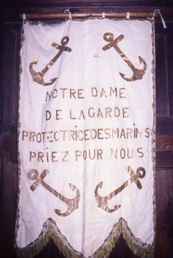 Bannière présentant au recto un voilier de type trois mats qu'une une Vierge couronnée, dite Notre-Dame-de-la-Garde, semble bénir de sa main droite. Assise sur des nuages, elle tient de la main gauche une ancre de marine. Deux étoiles à cinq branches encadrent le bateau. Au verso, inscription et ancres de marine. Bannière à franges façonnées or.