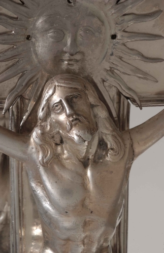 Les trois branches plates sont terminées par des têtes d'angelots fondues rapportées et ajourées. Sur le noeud, décor repoussé à trois médaillons et têtes d'angelots rapportées. Au-dessus du noeud, rangée de perles et grosse virole ornée d'un feuillage de lauriers. Au départ de la croix, ornementation de grandes palmettes repoussées, flanquée de motifs ajourés fondus et rapportés. Christ et titulus fondus. Soleil découpé et repoussé-ciselé.