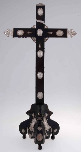 Croix reliquaire de la vraie croix, en bois noirci et plaques d'argent, réalisée à Rennes, entre 1775 et 1781. Restaurée par l'atelier Evellin de Rennes en 2006.