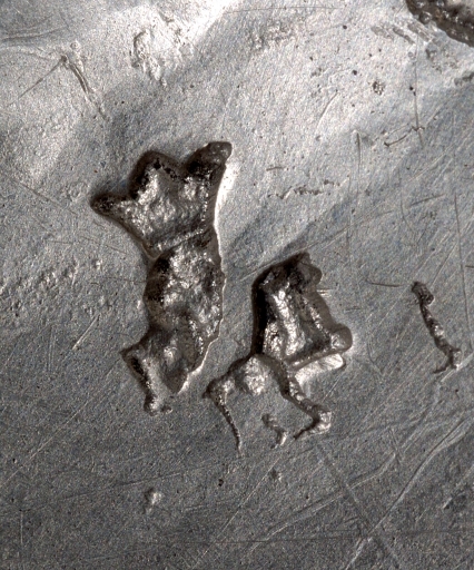Poinçon : animal ? sous une fleur de lys (sur le pied et la patène). Poinçons (sous le pied et sur la patène) : poinçon de maître non identifié, lettres P R I ? couronnées ; autre poiçon de maître non identifié : lettres S R H couronnées. Inscription : L'AB de LA MOTTEROUGE CHA de ST BRIEUC DESSERVANT ST MARTIN 1807 (gravé sous le pied).