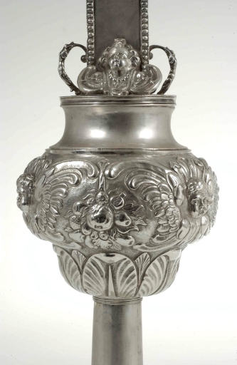Croix de procession réalisée vers le milieu du 17e siècle par un orfèvre inconnu de Saint-Malo, à comparer avec la croix de Pléneuf-Val-André due à l'orfèvre malouin Guillaume Hamon.