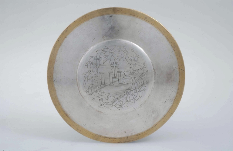 La patène assortie porte le monogramme du christ entouré d´une couronne d´épine entrelacée, iconographie qui se retrouve alors fréquemment sur les ornements liturgiques.