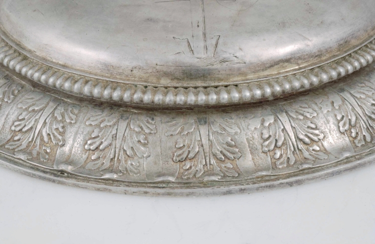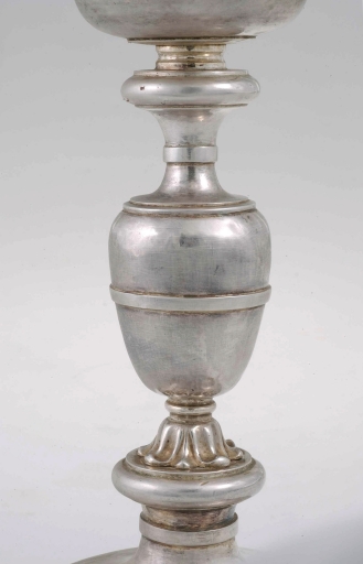 La déclinaison des modèles créés au XVIIe siècle est ici une fois de plus évidente. Toutefois, la plus grande hauteur du calice, qui atteint presque 30 centimètres, le profil de la coupe et la largeur de la bordure du pied, appartiennent incontestablement au XVIIIe siècle. L´estampage de feuillage, lui aussi hérité du siècle antérieur, n´est pas non plus identique ; il est ici en plein et non plus découpé, caractéristique qui permet d´y reconnaître à coup sûr la marque d´une fabrication du XVIIIe siècle. La très grande sobriété du décor n´exclut pas une réelle qualité d´exécution, comme le montre, la bordure à godrons qui souligne l´intérieur du pied ainsi que les bagues unies rapportées et soudées sur le col du pied, le noeud et la prise sous la coupe. Seule la technique précise de l´application permet de faire entrer le jeu subtil de ces éléments de modénature dans la silhouette générale de l´objet.