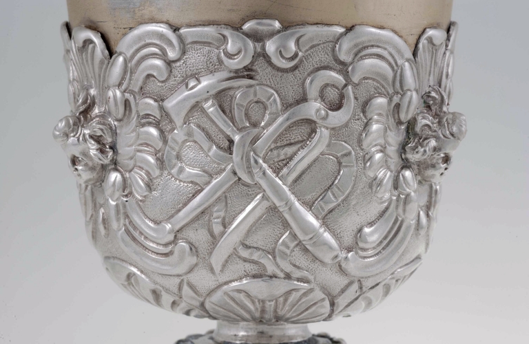 Ce bel exemple est particulièrement représentatif des calices de modèle « riche » de la deuxième moitié du XVIIe siècle. L´iconographie des instruments de la Passion est répartie sur le dessus du pied, le noeud ainsi que la fausse coupe, en alternance avec des têtes d´angelots. La ciselure, nerveuse, qui rehausse d´un cerne appuyé le contour des formes, associée à l´emploi du fond mati, lui conserve malgré la saturation du décor une grande lisibilité. Le bord perlé qui souligne la cloche du pied fait écho aux bagues du noeud que rehaussent également de discrets anneaux cordés. La large bordure du pied dont l´estampage fait alterner deux types de feuillages contribue à asseoir l´équilibre de l´objet. La patène, assortie qui porte les mêmes poinçons que le calice, porte le monogramme du Christ surmontant un coeur enflammé, illustration de la dévotion du Sacré Coeur qui se répand au cours du XVIIe siècle.