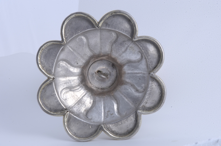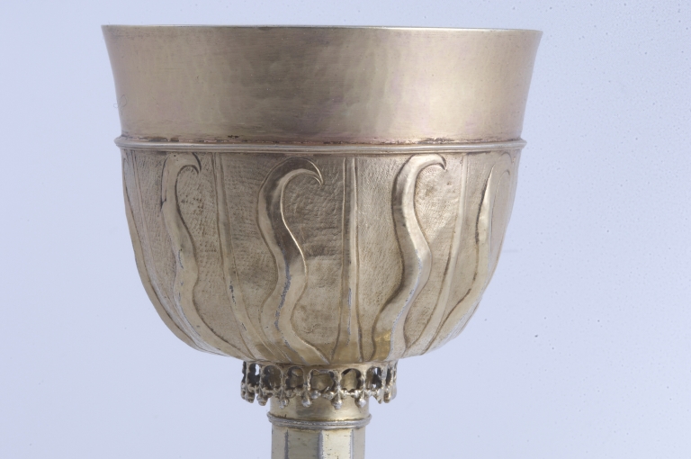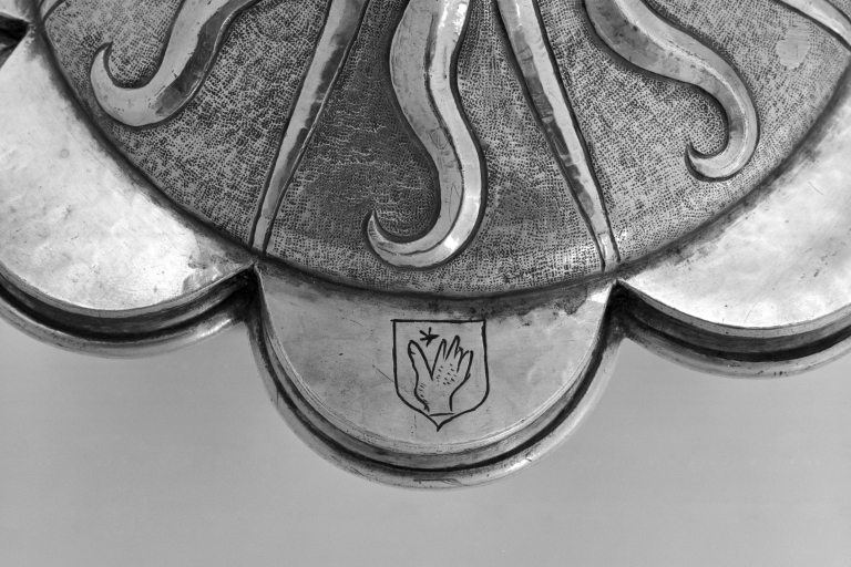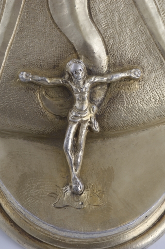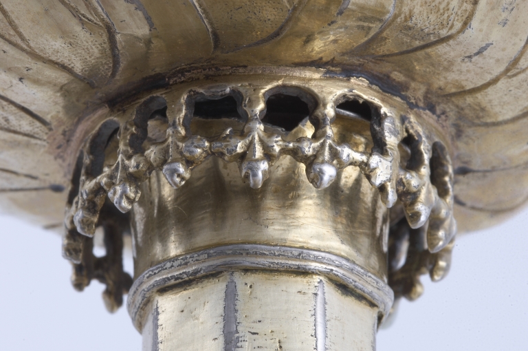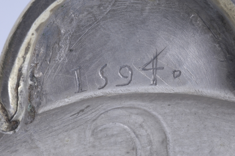 Bien que ne portant pas de poinçons, ce calice d´une belle qualité d´exécution présente le grand intérêt d´être daté, de 1594, par une inscription gravée sous le pied. Celle-ci fait état de la donation de l´objet par la fille de Charles Marot, riche dinannais appartenant à une famille qui compte à la fin du XVIe siècle plusieurs syndics de la ville ainsi qu´un sénéchal anobli par Henri IV en 1598. Les armoiries gravées sur le pied -une main dextre accompagnée d´une étoile- sont celles de cette famille bourgeoise en voie d´anoblissement qui eut un rôle de premier plan dans les fondations hospitalières de la ville entre le XVIe et le XVIIIe siècle. Les boutons du noeud gravés de quintefeuilles portant des traces d´émail, s´inscrivent encore dans la tradition gothique. Par contre, le décor de rayons et de flammes qui orne le pied, le noeud et la fausse coupe, présent sur les oeuvres rennaises du milieu du XVIe siècle, est encore employé à Paris à la fin du siècle, ainsi que le montre le calice de Fréhel, réalisé en 1597 par l´orfèvre parisien Jérôme Acher. L´emploi de couronnes ajourées au sommet du pied, inconnu à Paris, se retrouve dans les calices nantais de la même époque, ainsi que sur un calice de Corentin le Baron, orfèvre de Quimper, daté de 1583. Ici, de façon originale, la même couronne, inversée orne à la manière d´un lambrequin la partie inférieure de la fausse coupe.. Il convient de noter que ce calice se démonte entièrement à l´aide de pas de vis, celui qui se trouve sous le pied comportant une pièce soudée à l´équerre pour former clef. Ce principe rappelle celui de plusieurs calices de Basse Bretagne de la même époque, dont le pied pouvait éventuellement servir de support pour un ostensoir. C´est peut-être ici le cas de cet objet.