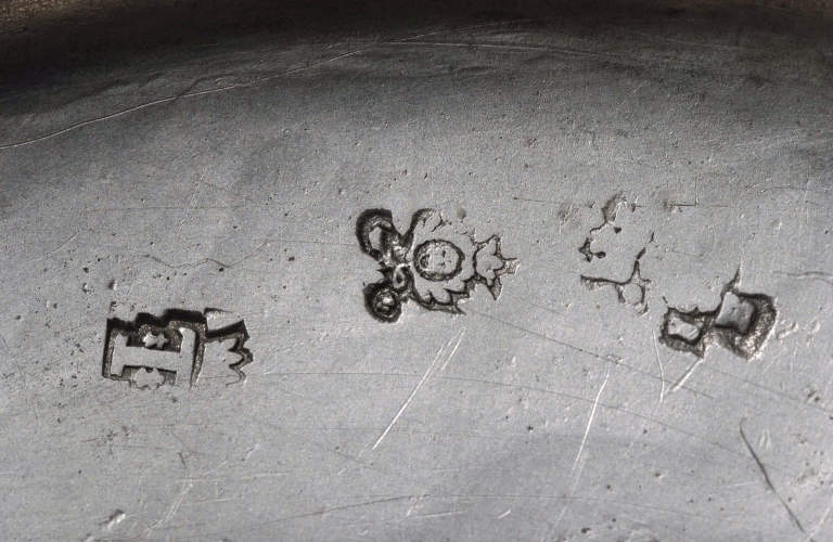 Poinçons (sous le pied) : initiales I et B séparées par une fleur de lys, surmontée de deux grains de remède et d'une couronne ouverte, maître Jean-Baptiste Boullemer ; communauté de Rennes, 1730 : lettre T couronnée entre deux hermines. Poinçon de marque : tête de face entourée d'une guirlande, étoile en pointe à droite : Rennes vers 1725-1730. Armoiries (gravées sous le pied, supportées par deux lions et surmontées d'une couronne de marquis) : au 1 d'Acigné, au 2 lion couronné azur et sinople à mi corps, au 3, d'azur au chevron d'argent accompagné de trois têtes de léopard de même, famille de Boiséon, au 4 d'azur à dix étoiles d'argent famille de Kerveno, sur le tout, d'azur au lion d'argent couronné, famille du Breil.