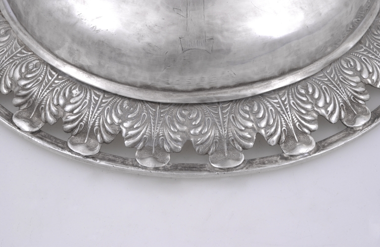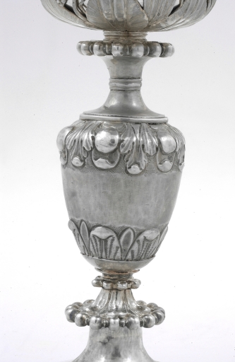 Base aux feuilles repercées. Noeud uni à deux bandes de feuilles de culot. Collerettes godronnées.