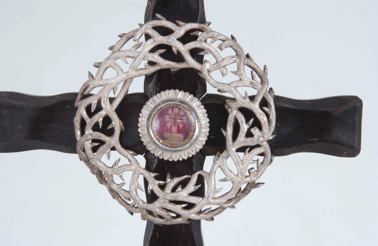 Christ en argent debout tenant de sa main droite une croix d'ébène qu'il désigne de l'autre main. Relique entourée d'une couronne d'épines à la croisée de la croix.