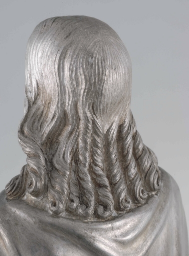 Poinçon à la base de la tunique du Christ à l'arrière : Poinçon de fabricant : en toutes lettres dans cartouche rectangulaire : DESURY, SAINT BRIEUC. Garantie gros ouvrages Ier titre départements 1838-1973 : tête de Minerve.