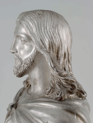 Oeuvre originale par l'iconographie du Christ présentant sa croix. La physionomie du Christ, très inspirée par l'esthétique ingresque, est ici servie par une exécution de qualité. Une technique de mati exécutée à l'aide d'une brosse, également employée pour le buste de Saint Mathurin de Moncontour donne au métal un aspect satiné très particulier. La barbe reprise en ciselure et la chevelure, mise au mat au poinçon, contribuent à individualiser le visage. Ces raffinements de finition, associées à des éléments estampés en série tels que la couronne d'épine, les guirlandes et le galon qui ornent le socle, montrent la réussite de l'atelier Desury qui parvient à concilier dans le contexte général du XIXe siècle, le maintien d'une production de qualité avec celui des exigences commerciales.