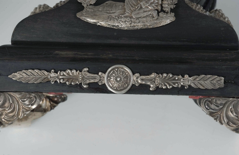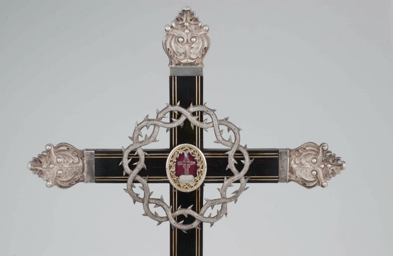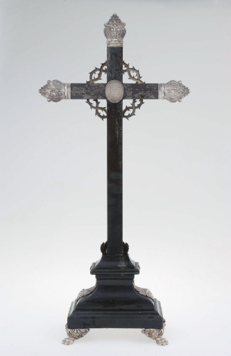 Inscrite dans la tradition des croix reliquaires, en ébène ou bois noirci rehaussées de garnitures d´argent inaugurée au XVIIIe siècle, cette croix, due à l´atelier Desury de Saint Brieuc, dont elle porte, sous le fond l´étiquette de vente, échappe aux poncifs de la multitude de ce genre d´objets produite à partir du début du XIXe siècle qui reproduit presque toujours un modèle stéréotypé. Cette oeuvre bien que de qualité n´échappe d´ailleurs pas à l´évolution mécanique de l´époque puisque la plupart de ses ornement sont estampés et non plus ciselés en manière directe comme au siècle antérieur. Pour autant, elle se distingue tout d´abord par la mise en oeuvre soignée du support lui-même, ébène massif incrusté de filets d´argent doré pour la croix et chêne plaqué d´ébène pour le socle, mais surtout par la richesse de ses garnitures d´argent et le choix d´une iconographie relativement savante En effet, si la couronne d´épine qui encercle la croisée, est traditionnelle sur ce type d´objet, son surdimensionnement lui confère ici un impact particulier. Le décor du socle, particulièrement remarquable intègre, dans un environnement encore néoclassique, la scène assez rarement représentée, de l´agonie du Christ à Gethsémani dite aussi du Jardin des oliviers.