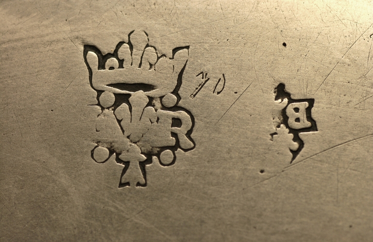 Poinçon de maître : initiales L (peu lisible) et R, deux points et une hermine en dessous, une fleur de lys entre les deux, deux points et une couronne fleurdelisée sur le tout, Louis Le Restif, orfèvre à Saint-Brieuc. Marque de Saint-Brieuc, vers 1704 (mal insculpé) : lettre B et hermine et fleur de lys.