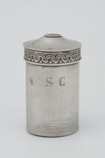 Coffret ovale contenant à l'origine deux ampoules, dont une seulement est conservée ainsi qu'une petite verseuse en forme de tasse droite.