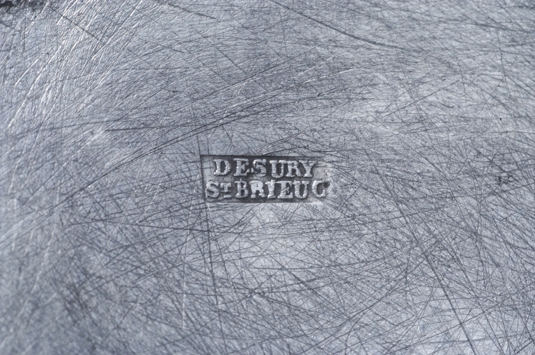 Inscription SC : (saint Chrème), sur l'ampoule conservée. Poinçons (à la base du coffert, sous la verseuse et l'ampoule) : poinçon de fabricant, DESURY SAINT-BRIEUC, dans un cadre rectangulaire ; garantie menus ouvrages départements, 1818-1838 : un crabe.