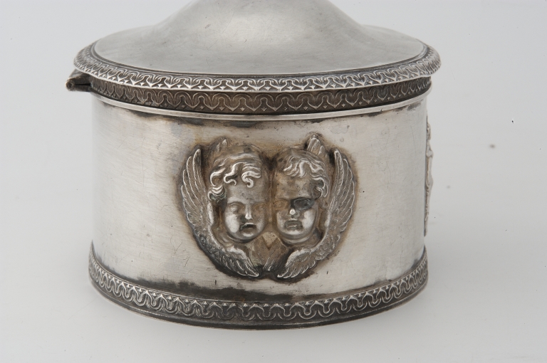 Têtes d'anges formant prises aux extrémités du coffret. Le médaillon du baptême du Christ rapporté par l'intérieur du coffret est encastré dans un ovale découpé dans la face antérieure.