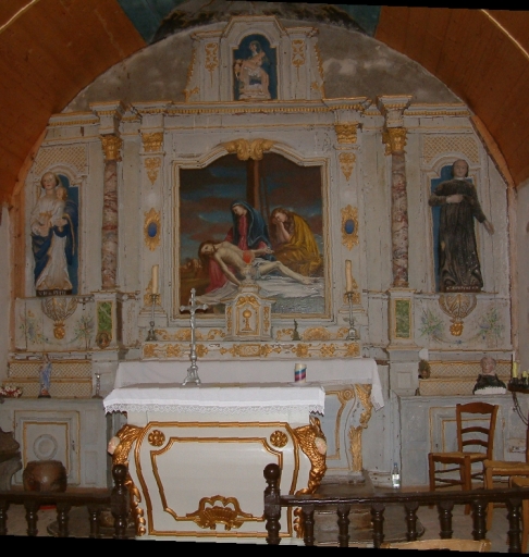 Maître-autel composé d'un autel, de deux gradins, d'un tabernacle, de deux colonnes en faux marbre sur stylobathes encadrant un tableau de la Pietà. Les travées gauche et droite reçoivent deux statues sur culots. Des motifs floraux sont peints sous les culots. Deux travées de côté sont composées de deux portes et deux gradins. La corniche reçoit un troisième niveau avec une statue. Associé au retable, un trompe l'oeil en forme de cul-de-four est peint sur le lambris.