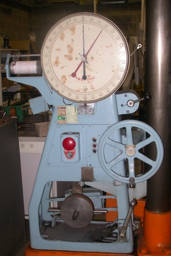 Cette machine de traction sert aux essais mécaniques pour mesurer la résistance du métal. On place une éprouvette en acier, sur laquelle on tire jusqu'à la rupture, ce qui permet de mesurer sa résistance. Elle permet également de faire des essais de pliage.