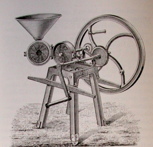 Concasseur à grains d'un poids approximatif de 130 kg, mû à bras, mais pouvant aussi fonctionner avec un manège de chevaux, un moteur électrique, thermique ou à pétrole, entraînant une poulie, qui fait tourner une meule mobile (en pierre piquée ou en fonte) sur une meule fixe, dans une caisse en bois. Le châssis est entièrement en bois. La trémie de forme carrée, qui reçoit le grain à moudre, mesure 68 cm sur sa partie supérieure.