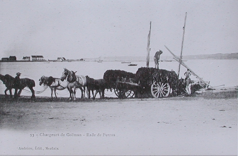 La faucille à goémon ou "ar wignet" en breton, est un outil manuel utilisé par les pêcheurs goémoniers à pied pour couper les algues sur l'estran, en particulier les algues brunes, mais aussi le "goémon blanc" ou lichen. Le lichen était prélevé aux Sept-Îles par les Finistériens qui y vivaient une partie de l'année (à l'Île Plate) et y faisaient de la soude. Une première famille originaire de Plouguerneau vint s'installer aux Sept-Îles au début du 20ème siècle, Apriou. En 1937, leur bateau fit naufrage par une tempête de sud ; le père, la ère et le cheval e noyèrent, un seul enfant fut récupéré (tradition orale). Cette pratique goémonière aux îles se poursuivit jusqu'aux années 1990 avec la famille Senan, originaire de l'île de Batz. Les goémoniers allaient aussi faire les laminaires avec une longue faucille emmanchée dans les champs d'algues à l'ouest de Malban et dans une baie abritée, en pleine mer "Men a suk". Les algues de rive étaient coupées pendant la grande marée de février, appelée la "chandilour", que l'on peut traduire par le temps de la chandeleur : en effet, la coupe des algues était traditionnellement réglementée depuis Colbert et la Révolution française, en suivant le calendrier religieux. Chaque paroisse promulguait un arrêté communal qui faisait commencer la coupe en février (au moment de la chandeleur) et la treminait à la fête de la saint-Yves, au mois de mai. Chaque famille avait son rocher dans les grèves jusqu'au chenal qui menait au port de Ploumanac'h. Les cultivateurs allaient eux mêmes cueillir les algues avant d'engraisser les champs en lanière de Mezo braz, cultivés collectivement en pommes de terre et en céréales (cultures en convenant). Les goémon d'échouage représentaient aussi un apport intéressant, ramassé avec des crocs à Pors Rolland. Les bateaux goémoniers, tous gréés en flambart, avant la seconde guerre mondiale, débarquait leur chargement à l'ancienne cale Blassen, au fond du port de Ploumanac'h (détruite aujourd'hui). Le transport à terre se faisait avec des brouettes et des civières depuis la grève avant d'emprunter un charroi. Sur les quais de Ploumanac'h et de Perros-Guirec, chacun avait son tas de goémon. Le goémon pouvait aussi être utilisé comme moyen de chauffage en alternance avec les "modens" (mottes de racines de bruyère, tourbe), prélevées avec la tranche dans les landes côtières pendant l'été, pour "closer" le feu, le border. On utilisait aussi les fougères. Les modens étaient mis en tas sur la côte comme le goémon pour perdre leur eau. Le peintre-douanier Louis-Marie Faudacq (1840-1916) fut le témoin privilégié de cette activité goémonière à la fin du 20ème siècle, qu'il a reproduit dans ses nombreux dessins. Au début des années 1950, un atelier de transformation des algues, dirigé par M° Le Floch, traitait les algues marines et le maërl, ramassés en bateau, au nord des Sept-Îles. Les produits, comme des sachets de "bains de mer à domicile", l'algogange (boues thérapeutiques) et un dentifrice à l'eau de mer étaitent commercialisés par cette entreprise dénommée "Centre de recherche et d'application de la biologie marine de Perros-Guirec".