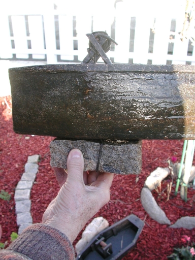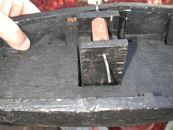 Maquette d'un "coucou", bateau en bois de transport des blocs de granit, chargés à même à la grève. La maquette est réalisée en bois comme une charpente à franc bord, avec trois membrures et un fond plat. La coque est relativement grossière et trapue, ronde des deux côtés, avec un franc-bord assez haut. Elle dispose d'un puits en son milieu et d'un treuil pour soulever les blocs de pierre, amarrés avec une chaîne, qui vont se coller sur le fond de la coque à marée haute et pouvoir être hissés contre ce puits, pour être ensuité déchargés au port de l'Ile-Grande. La maquette mesure 35 cm de long sur 14 cm de large et 10 cm de hauteur. Le bateau mesure 6 mètres de long et est manoeuvré avec seulement des avirons de nage.