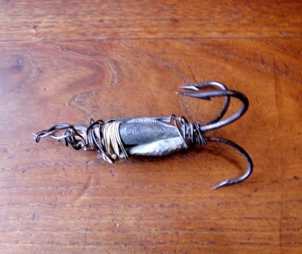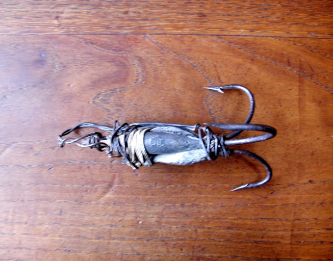 Les turluttes repérées dans une famille de Binic sont de formes différentes : la 1ère (fig.1) présente une forme oblongue, coulée en plomb, peinte de couleur blanche. Le plomb est percé à une extrémité pour amarrer l'empis, il est recouvert d'une couronne de pointes à l'autre extrémité. Cette petite turlutte mesure 7, 5 cm. La 2ème turlutte, présente une forme identique, avec une longueur de 15 cm. Le plomb en forme de poisson est équipé de trois hameçons, le tout étant "tortillé" avec du fil de fer. Cette 2ème turlutte présente les intiales LB ou LD gravées sur la masse du plomb.