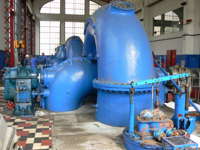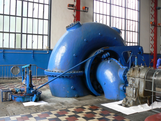 Cette unité de production d'énergie située dans la salle des machines est composée de trois turbines hydrauliques de type Francis associées chacune à un alternateur.
