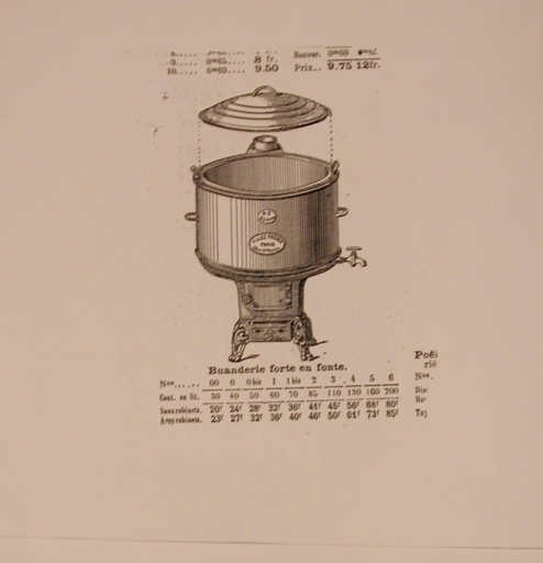 Cette baignoire est fabriquée en zinc avec un dossier inversé et des soupapes. Elle disposait à l'origine de roulettes et d'un socle.