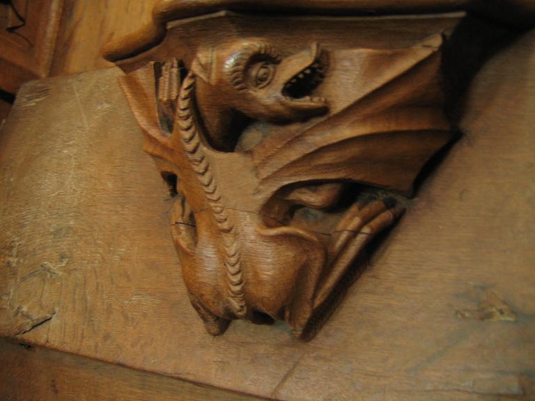 Sur la miséricorde : un dragon est représenté de dos, vu du dessus. Il tourne sa tête vers la droite et ouvre la gueule montrant ainsi ses dents acérées. Quadrupè;de, ses pattes sont crochues et il est pourvu d'ailes de chauve-souris. Son épine dorsale est parcourue d'une crête en dents de scie. Ses yeux sont bordés de longs cils et ses pupilles ne sont pas creusées.