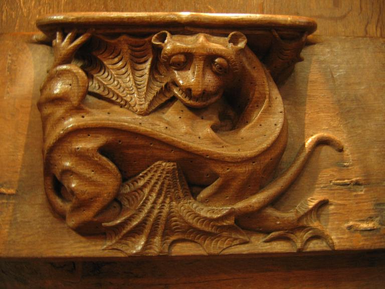 Sur la miséricorde : dragon quadrupède ailé, vu du dessus et tourné vers la droite. L'animal retourne sa tête et regarde le spectateur. Ses deux grandes ailes, semblables à celles d'une chauve-souris, sont striées de la même manière que ses pattes de palmipèdes. Son épine dorsale est visible et se prolonge par une très longue et fine queue qui passe sous la cuisse droite de l'animal avant de revenir devant lui. La forme de la tête se situe entre celle d'un singe et d'un félin : le museau est fin, les yeux bordés de sourcils épais, les oreilles petites et en pointe, la gueule arrondie. Il ouvre la bouche comme s'il souriait, découvrant ainsi ses dents. Le corps est traité avec une certaine plasticité mettant l'accent sur les muscles. A noter que la patte antérieure gauche n'est pas palmée et s'appuie sur l'aile gauche contrairement à celle de droite qui est cachée.