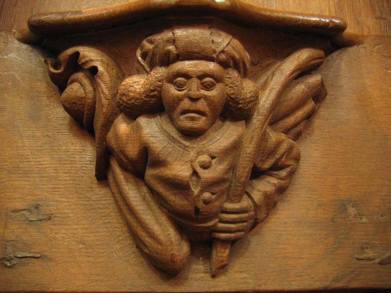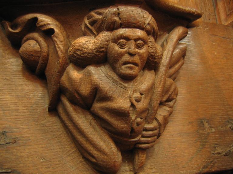 Sur la miséricorde : un homme, représenté en buste et de face, tient un bâton ou une palme dans la main gauche et une sorte de bouclier dans la main droite. Il est assez richement vêtu : une veste boutonnée sur le devant et un chapeau à bourrelet, proche du turban dans la forme, et décoré d'un galon central. Son visage est individualisé avec un menton en galoche, un nez aplati et des sourcils épais. Les pupilles sont creusées.