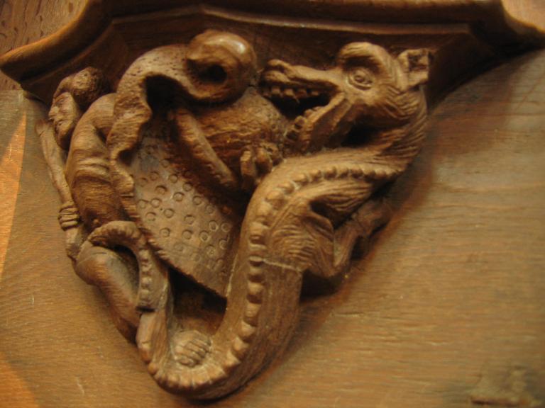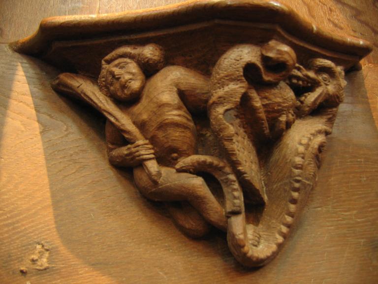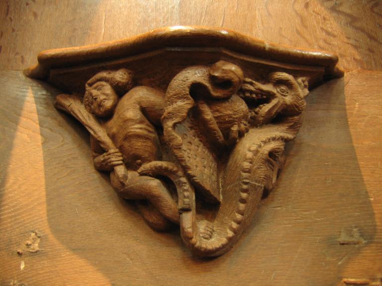 Sur la miséricorde : un homme nu et armé d'une massue se tient sur la gauche de la miséricorde, de trois quart, et regarde le spectateur. Son pied droit est posé sur la queue d'un dragon qui occupe la droite de la miséricorde. Celui-ci est en train de mordre dans un végétal fabuleux qui semble servir de bouclier à l'homme nu. Le dragon est vu partiellement de dos et son échine est parcourue d'une crête aux sommets arrondis. Sa gueule est allongée et ses dents visibles. Quant à l'homme, il a les cheveux qui lui arrivent aux épaules, le visage rond et la bouche entrouverte.