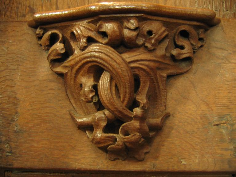 Sur la miséricorde : deux grandes formes végétales ondulantes et nervurées sont entrelacées par la tige.