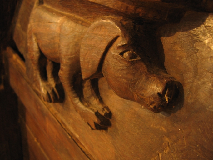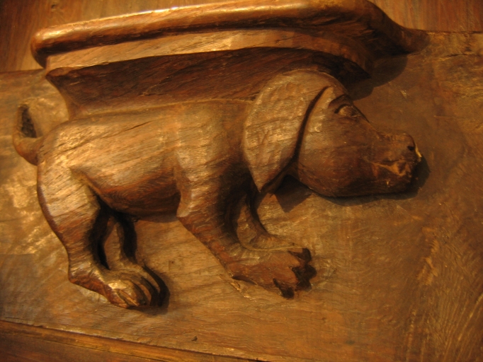 Sur la miséricorde : chien vu de profil et tourné vers la droite de la miséricorde. Le corps est massif, les oreilles longues, tombantes et pointues. Sa gueule est plutôt celle d'un porc avec des joues importantes et le museau relevé. Néanmoins, il montre les dents comme s'il grognait et ses pattes sont pourvues de doigts et non de sabots. Il possède en outre une queue.