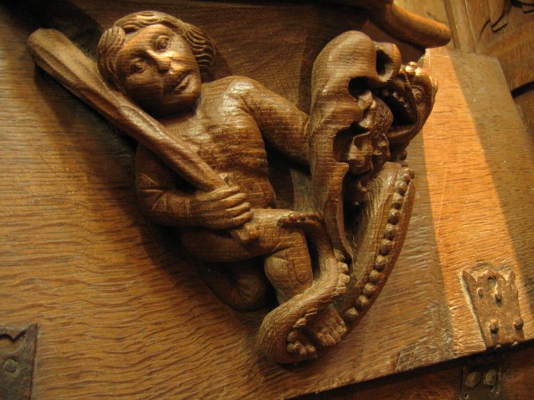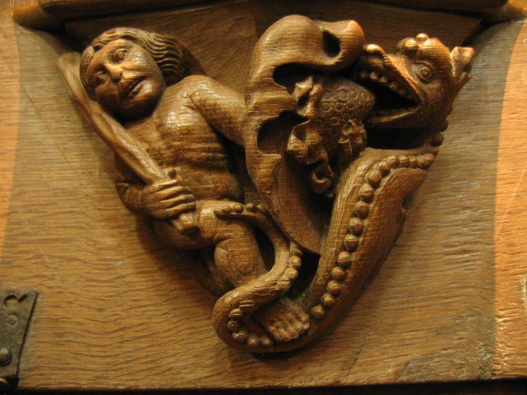 Sur la miséricorde : un homme nu et armé d'une massue se tient sur la gauche de la miséricorde, de trois quart, et regarde le spectateur. Son pied droit est posé sur la queue d'un dragon qui occupe la droite de la miséricorde. Celui-ci est en train de mordre dans un végétal fabuleux qui semble servir de bouclier à l'homme nu. Le dragon est vu partiellement de dos et son échine est parcourue d'une crête aux sommets arrondis. Sa gueule est allongée et ses dents visibles. Quant à l'homme, il a les cheveux qui lui arrivent aux épaules, le visage rond et la bouche entrouverte.