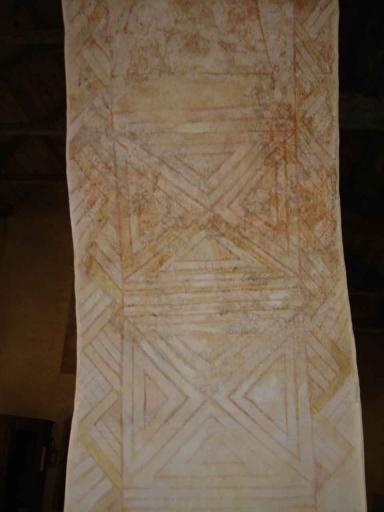 Les deux premières arcades de la nef présentent des motifs de rinceaux végétaux identiques, bien que celui présent sur l´arcade sud soit presque entièrement masqué par des rinceaux du 16e siècle. Les arcades suivantes possèdent un décor figuré réalisé selon une composition identique pour chaque intrados : deux personnages en pied représentés de face occupent chacun la moitié de l´intrados, ils sont séparés et encadrés par des motifs géométriques. Aux pieds de ces deux personnages figurés se trouve un espace carré occupé par des motifs géométriques ou des bustes. Dans la deuxième travée, l´arcade nord ne conserve aucun décor ; l´arcade sud représente saint Michel et Melchisédech. Saint Michel est figuré nimbé et ailé. Dans un linge qu´il tient devant lui se trouve un autre personnage de petite dimension, les mains jointes à hauteur de son visage. Il s´agit probablement de la représentation de l´âme. Melchisédech est également nimbé, vêtu d´une chasuble aux manches très amples, il lève ses mains à hauteur de ses épaules et les tend paumes en avant. Les arcades suivantes, appartenant aux troisième et quatrième travées de la nef, présentent toutes des représentations d´anges, excepté la quatrième arcade sud, reconstruite donc dépourvue de décor. Ces anges sont représentés de face et en pied, ils adoptent la même posture avec leurs mains levées à hauteur d´épaules, paume droite tendue vers l´avant. Ils sont tous nimbés et ailés et tiennent dans leur main gauche un livre fermé. Ils portent, pour la plupart, une robe longue serrée à la taille, aux manches légèrement évasées comme le bas du vêtement. Ces robes sont couvertes de motifs, différents pour chaque ange : lignes courbes aux tons différents, motifs géométriques. Les revers du bas de la robe et des manches, les cols et liens au niveau de la taille sont d'une couleur distincte de celle du vêtement. L´un des anges porte une chasuble. Sous les anges se trouvent des motifs variés, géométriques ou parfois figurés. Les motifs figurés conservés sont ceux de deux hommes barbus, sans ailes, dans la même attitude que les anges avec également un livre dans la main gauche, l´un est nimbé et porte une chasuble, le second sans nimbe est vêtu d´une simple robe.