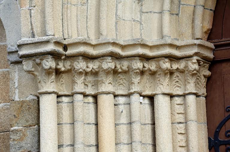 Le portail : Les chapiteaux nord : au registre inférieur se trouvent de longues feuilles plates nervurées, recourbées dans leur extrémité, supportant ainsi les motifs de la partie supérieure de la corbeille. Il s'agit de vifs enroulements de végétaux formant des volutes dans les angles, reliant les chapiteaux dans leur partie haute, sous le tailloir. Cette frise est soulignée par la moulure continue des astragales et par le tailloir. Au centre, le décor est plaqué entre les colonnes et chapiteaux sur les ébrasements à ressauts du portail, décor constitué de motifs de feuilles et tiges entrelacées. Côté sud : entre astragales et abaques existe un espace propice au développement d´un décor en frise, cependant, chaque chapiteau est distinct de son voisin et présente un traitement beaucoup plus en volume. Chacun des chapiteaux présente deux registres de crochets issus de grands lobes de feuilles en cuiller. Ces retournements vigoureux, ce traitement plus animé, cette sculpture plus détachée de son support témoigne d´une nouvelle conception.