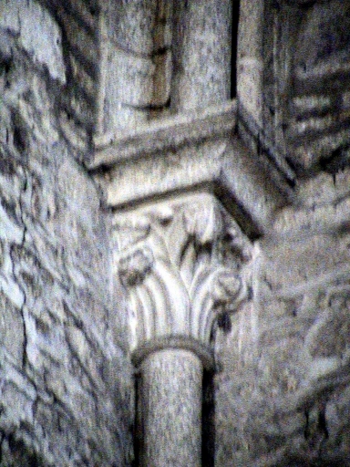 Les voussures du portail de l´ancienne abbatiale reposent de chaque côté sur six colonnes couronnées chacune d´un chapiteau en granite. Leur tailloir est épais, à deux moulures et présente un angle droit. Au Nord comme au Sud, les six chapiteaux sont ornés de motifs identiques. La façade présente également deux autres chapiteaux au registre inférieur. Le portail est encadré de chaque côté de deux arcades aveugles jointes par une colonnette couronnée d´un chapiteau. Côté sud, la disposition du chapiteau semble se rapprocher de ceux observés dans les ébrasements du portail, mais ce chapiteau est très abîmé. Au Nord, au contraire, le chapiteau est très bien conservé. Cet exemple semble être à la frontière entre tradition et nouveauté. La corbeille est ornée de motifs de feuilles plates dont s´échappent sur plusieurs registres d´autres feuilles extrêmement courbées, prenant beaucoup de volume. Les colonnes engagées dans les murs goutteraux de la nef possèdent des chapiteaux en granite. Sous d´épais tailloirs moulurés, aux angles droits, les corbeilles sont entièrement recouvertes de motifs végétaux, prédominants dans les choix iconographiques du ou des artistes de l´abbaye de Léhon. Chaque support, formé d´une colonne engagée cantonnée de deux colonnettes est couronné par un ensemble de trois chapiteaux. Ils mettent en évidence une conception différente et novatrice par rapport aux sculptures de l´ancien cloître du 12e siècle. De grands motifs de stries en relief s´élancent de l´astragale et se divisent en multiples feuillages stylisés d´où s´épanouissent de petits mais nombreux et vigoureux crochets. D'autres chapiteaux de la nef sont ornés de grands limbes ondulés. Ces exemples reflètent un nouveau choix stylistique avec l'abandon progressif de la composition caractérisée par la superposition des éléments sculptés, issue du modèle corinthien. Dans le choeur les chapiteaux sont uniques, élancés et fins car ils couronnent de minces colonnettes. Ils sont couverts de multiples formes de végétaux, les feuillages sont variés et tendent vers un aspect plus naturaliste que dans la nef. Le traitement est également plus libre, moins contraint par la symétrie ; la sculpture devient plus fantaisiste. La composition moins formelle autorise le sculpteur à exprimer un nouveau répertoire iconographique qui s´enrichit d'éléments plus dynamiques, comme les bourgeons qui éclatent des feuillages. Les colonnettes du choeur reposent sur des culots formés d´un dosseret dans lequel s´inscrit un motif sculpté figuré. Ces culots représentent des visages d´une toute autre facture que les mascarons du portail ou des contreforts. Ce sont des grotesques. L´un des exemples présente un visage aux traits épais, à la chair joufflue, avec des mains qui semblent serrer le cadre dans lequel il s´inscrit. Un autre culot est traité plus finement : un visage aux grandes oreilles. Le traitement stylistique de ces éléments, de même que le granite employé et l'aspect de surface de la pierre, laissent penser qu'ils appartiennent à la campagne de restauration de la fin du 19e siècle.