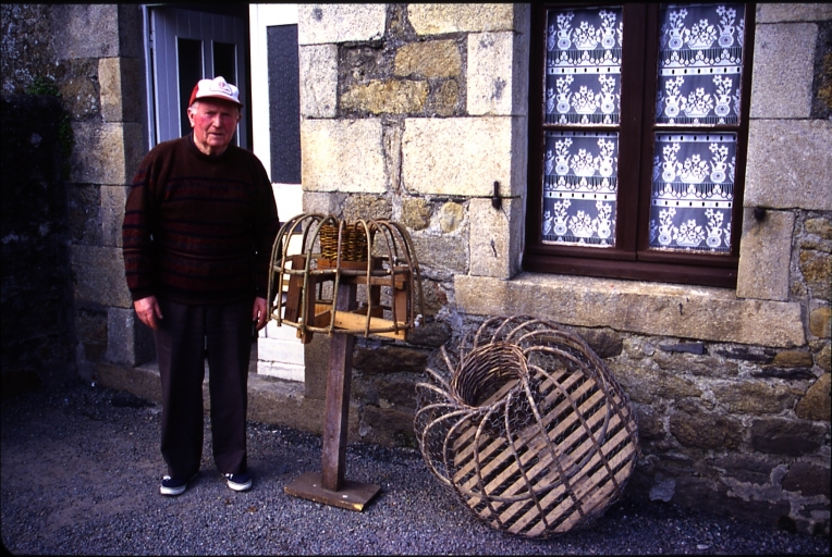 Le gabarit pour fabriquer les casiers à homards a été confectionné par Maurice Aubin (dit Pierre Aubin) vers 1985. Cependant, ce type de gabarit était utilisé à St-Jacut depuis le 1er quart du 20ème siècle pour les casiers à homards. On retrouve ce type de casier en osier, en rejets d'orme ou en châtaignier, avec ces formes cylindriques sur la côte Nord de Bretagne depuis la fin du 19ème siècle, avant l'introduction du casier en plastique ou en métal. Les casiers devaient être trempés longtemps dans l'eau de mer parce que les grands crustacés n'aimaient pas l'odeur du bois vert. Les homards étaient conservés dans des viviers en bois, appelés 'épargnes' à St-Jacut (témoignage de Pierre Aubin).