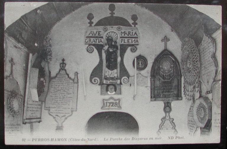 Les seuls 'Mémoires' authentiques des disparus en mer de la paroisse de Ploubazlanec se trouvent sous le porche de la chapelle de Perros-Hamon (18ème siècle), dont le 'mémoire' de Sylvestre Camus, disparu en mer le 18 juin 1856 à l'age de 16 ans, et celui de François Floury, capitaine du navire islandais 'Léopoldine', perdu en Islande en 1877 avec ses 22 hommes d'équipage. Depuis le milieu du 19ème siècle, les familles des marins ont pris l'habitude de fixer sous ce porche, ces panneaux de bois ou de marbre, des croix, sur lesquels sont inscrits les dates du défunt et le nom du bateau naufragé. La chapelle abrite aussi des vitraux qui rappellent la grande pêche à Terre-Neuve, dont celui du transept. L'ex-voto vitrail 'Ville du havre', de facture moderne, évoque le naufrage du brick le 'Ville du havre', parti de Paimpol en 1841, armé par un équipage, dont 16 hommes originaires de Ploubazlanec et du capitaine Méléart de Perros-Hamon. Ce navire transportait une quarantaine de 'graviers' pour Terre-Neuve. Réfugiées sur des glaces dérivantes, les 72 personnes embarquées furent toutes sauvées grâce aux prières des marins à la Vierge de Perros-Hamon, qui vinrent ensuite remercier à sa chapelle. Sept maquettes ex-voto soulignent la vocation maritime des paroissiens de Ploubazlanec. L'une d'elles s'appelle le 'Chili' et rappelle les longs courriers. Une goélette 'islandaise', le 'Pod Perros' (enfants de Perros), construite par Jean Leroux de Perros-Hamon a été offerte en 1974, à condition qu'elle soit portée en procession le jour du pardon. Une belle maquette de 'Terre-neuvier' a aussi été offerte comme ex-voto de remerciement à la Vierge. Une peinture classique datée de 1860 représente une apparition de la Vierge à des pêcheurs côtiers en grande difficulté. Le vitrail du 'Ville du Havre' et six parmi les maquettes, ex-voto de navires ont été inscrits par les monuments historiques le 5 mai 1982 et étudiés. étudiés. Pour la période islandaise de 1852 à 1935, on estime à 400 le nombre de marins de Ploubazlanec perdus sur toutes les mers du monde. L'association 'Plareneg Gwechall' fait visiter régulièrement la chapelle de Perros-Hamon.