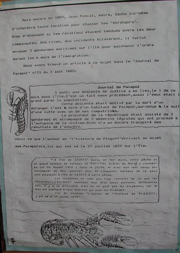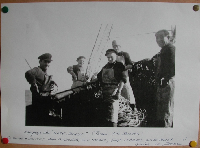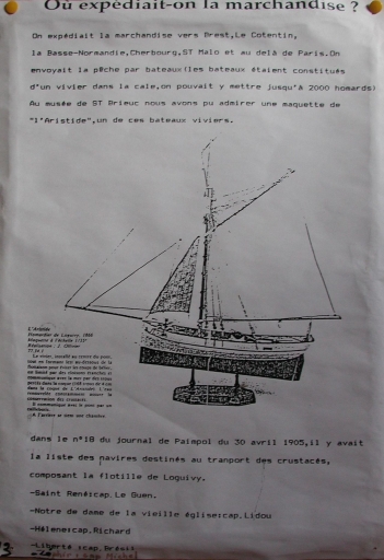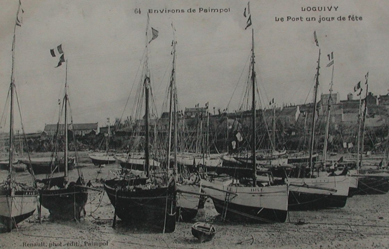 Au cours de la seconde moitié du 19ème siècle, délaissant les pêches traditionnelles de la région paimpolaise (maquereaux, lieus, congres et juliennes), les Loguiviens s'assurent le monopole du homard et de la langouste entre Saint-Malo et Brest, en armant des bateaux de plus en plus grands et performants, du lougre de 3 tonneaux au sloop homardier de 10 tonneaux, pontés ou demi pontés. Ils mènent ainsi leurs bateaux jusqu'au Conquet, l'Ile de Sein et Belle-Ile-en-Mer. Certaines familles font souche au Conquet ou à Sein, comme Constant Corfdir, patron de la 'Marie-Jeanne' en 1860. En 1879, 8 langoustiers de Loguivy passent l'été à l'Ile de Sein, souvent rejoints par leurs collègues du Conquet. Pendant l'été 1899, le langoustier entièrement ponté 'Louise-Marianne' de Guillaume Riou fait escale à l'Ile de Sein (fig.4) . Les circuits de vente vers Paris s'ouvrent à cette époque (1900-1920). A partir des années 1870, les Loguiviens installés au Conquet commencent à faire construire au chantier Olivier Derrien de Loguivy des bateaux gréés en sloop à l'imitation des caseyeurs de l'Iroise, comme les 'Trois-Frères' à Olivier Morvan (1871), le 'Saint-Jean' et le 'Saint-Pierre' à Pierre Kervarec, pilote au Conquet (1874). Mais c'est à partir de 1880 que ce type de gréement va progresser au port de Loguivy et s'imposer définitivement en 1893, avec 12 bocqs lancés cette année là. Vers 1900, Loguivy-de-la-Mer fait ensuite construire des bateaux pontés de plus grande taille (12 à 15 m et plus de 20 tonneaux), dans les chantiers Kerbiget de Paimpol, Chevert de Binic, Gouriou et Goasdoué de Loguivy de la Mer et Pauvy de Carantec ou encore Keranfors à Roscoff. On peut citer en 1909, le 'Saint-Antoine de Padoue' de 18 tonneaux (PL 2085), le 'Saint-Christophe' (PL 2098) de 18 tonneaux, tous deux armés par 4 hommes, et le plus grand 'Saint-René' (PL 2434) de 25 tonneaux. A partir de 1906, l'épopée loguivienne à l'Ile de Sein s'achève car la ressource diminue. Les marins pêcheurs loguiviens, les plus entreprenants s'aventurent dès 1910 dans des eaux de plus en plus lointaines : Cornouaille anglaise, Golfe de Gascogne et jusqu'aux côtes espagnoles et portugaises. Souvent armés par des mareyeurs, des bateaux à grands viviers apparaissent vers 1920, gréés en sloop ou en dundee et collectent les grands crustacés des homardiers et langoustiers. Ils disposent aussi d'un vivier dans leurs cales, qui leur confèrent des qualités de bons marcheurs grâce à ce lest liquide. Il existait déjà en 1850 des bateaux borneurs, également équipés de viviers. Ils étaient armés par les Paimpolais, qui allaient vendre leur pêche jusqu'en Normandie. La flottille langoustière compte jusqu'à 60 bateaux en 1920 avant de décliner en 1930 (moins de 40 bateaux) et surtout après la seconde guerre mondiale, à cause de la concurrence (Camaret), de la motorisation et des nouvelles techniques de pêche qui vont épuiser la ressource (les filets). Les Loguiviens se souviennent particulièrement du 'Paul Yvonne', de Jean Le Bellec et du 'Notre-Dame-des Grâces' de Guillaume Loguillard, en 1930, qui vont être remplacés après 1940 par le 'Tourmentin' de François et Yves Riou, le dernier langoustier de Loguivy à cul carré, puis par l'Ondine et le 'Stella' de Jean Riou (construction Daniel, Paimpol, 1960), et enfin le 'Zant Ivy', appartenant à Louis Corfdir. En 1992, les élèves des cours CM1 et CM2 de l'école publique de Loguivy ont réalisé avec leur enseignante Claudine Thoraval, un travail de collectage sur l'épopée des marins pêcheurs loguiviens entre 1850 et 1930. Cette recherche a donné lieu à l'édition d'un livret et d'une exposition sous forme de panneaux à la chapelle Saint-Yvi de Loguivy. Une partie de ce travail a été reproduit en illustration dans cette notice. Cette recherche a obtenu le second prix départemental du concours 'Les historiens de demain', mis en oeuvre par les Archives départementales. Cependant, les documents originaux n'ont pas été conservés et sont reproduits dans cette notice. En 1990, l'association des 'Homardiers des côtes de France', créée à Loguivy-de-la-Mer, sur l'initiative de Louis Le Bellec (président du Comité local des pêches), a obtenu la labellisation du homard breton et a utilisé comme symbole le bateau 'Enez Koalen', réplique d'un sloop homardier de Loguivy (type 1900) pour sa promotion.