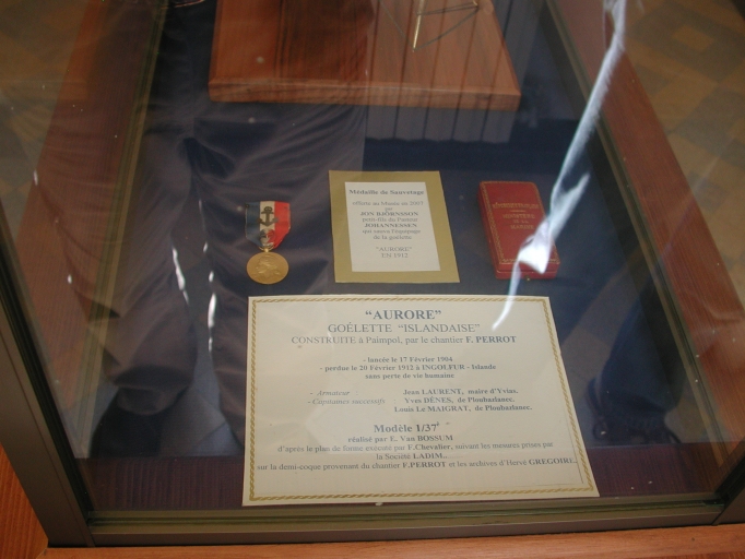 La maquette de la goélette 'Aurore' a été réalisée par E Van Bossum dans la seconde moitié du 20ème siècle et offerte au Musée 'Mémoire d'Islande' de Ploubazlanec. Cette maquette est la réplique de la goélette 'Aurore' construite en 1904 par le chantier naval F. Perrot de Paimpol, pour le compte de l'armateur Jean Laurent, maire d'Yvias à cette époque. Ce navire de grande pêche 'à Islande' fut successivement commandé par le capitaine Yves Dénes et par le capitaine Louis Le Maigrat. Il fit naufrage le 20 février 1912 à Ingolfur (Islande) sans perte pour l'équipage qui fut sauvée par le pasteur Johannessen. Une médaille d'honneur fut accordée à l'occasion de ce sauvetage par le gouvernement français (Ministère de la Marine) au pasteur. Son petit fils Jon Björnsson a offert cette médaille à l'association 'Plaeraneg Gwechall' et au musée en 2007.