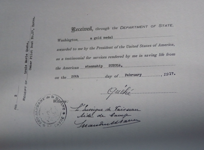 Cette médaille a été offerte par les Etats Unis d'Amérique à Louis Marie Quéhé pour avoir sauvé le 15 février 1917 un marin du steamer 'Suruga', tombé à la mer, au large du Havre. Louis Marie Quéhé était patron pilote du cotre 'H27-Elise Alexandre, lors de cet accident de mer.