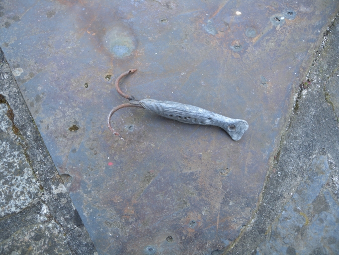 Hameçon équipé d'un leurre en plomb en forme de poisson enfilé sur une tige en fer recourbé, terminé par deux pointes recourbées et un anneau pour l'accroche. Le plomb sert de leurre. Dimensions : longueur 20 cm.