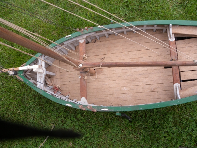 l = 139 ; la = 34 ; h = 109. Longueur hors tout : 130 cm ; longueur de coque : 94 cm ; longueur du bout-dehors : 33 cm : largeur au maître bau : 34 cm ; hauteur ou tirant d'air : 109 cm ; tirant d'eau : 29 cm.