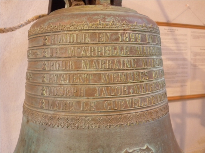 Inscription gravée : FONDUE EN 1899 EN L'HONNEUR DE N.-D. DE KERMASSAC'H / JE M'APPELLE MARGUERITE-FRANCOISE. J'EUS POUR PARRAIN FRANCOIS RIVOALLAN / POUR MARRAINE MARGUERITE LOAS, DAME JOSEPH-JACOB. / ÉTAIENT MEMBRES DU CONSEIL DE FABRIQUE : M.M. L'ABBÉ JOSEPH LE GOFF, RECTEUR. / JOSEPH JACOB, MAIRE. YVES GUILLOU, PRÉSIDENT. PIERRE LE CHEVANTON, TRÉSORIER. / MARC LE GUEVEL. FRANCOIS FAY. ISMAEL GOURONNEC. Marque de fondeur : Ch. DROUOT & G. THURIN / FONDEURS / A / DOUAI / NORD.